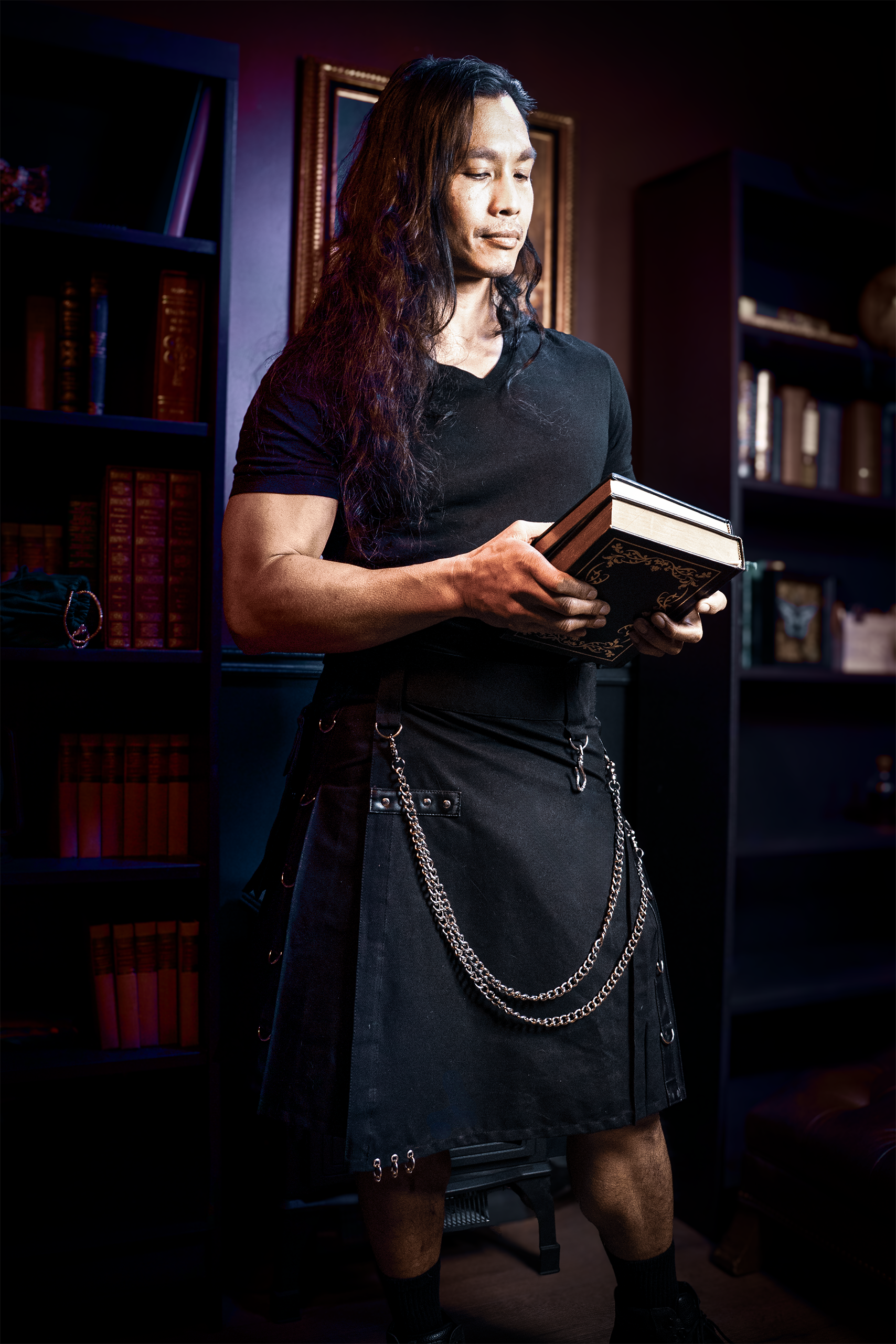 Black on black on metal. The Versatta Gothic Cargo Kilt features bold chain accents and black leather detail.