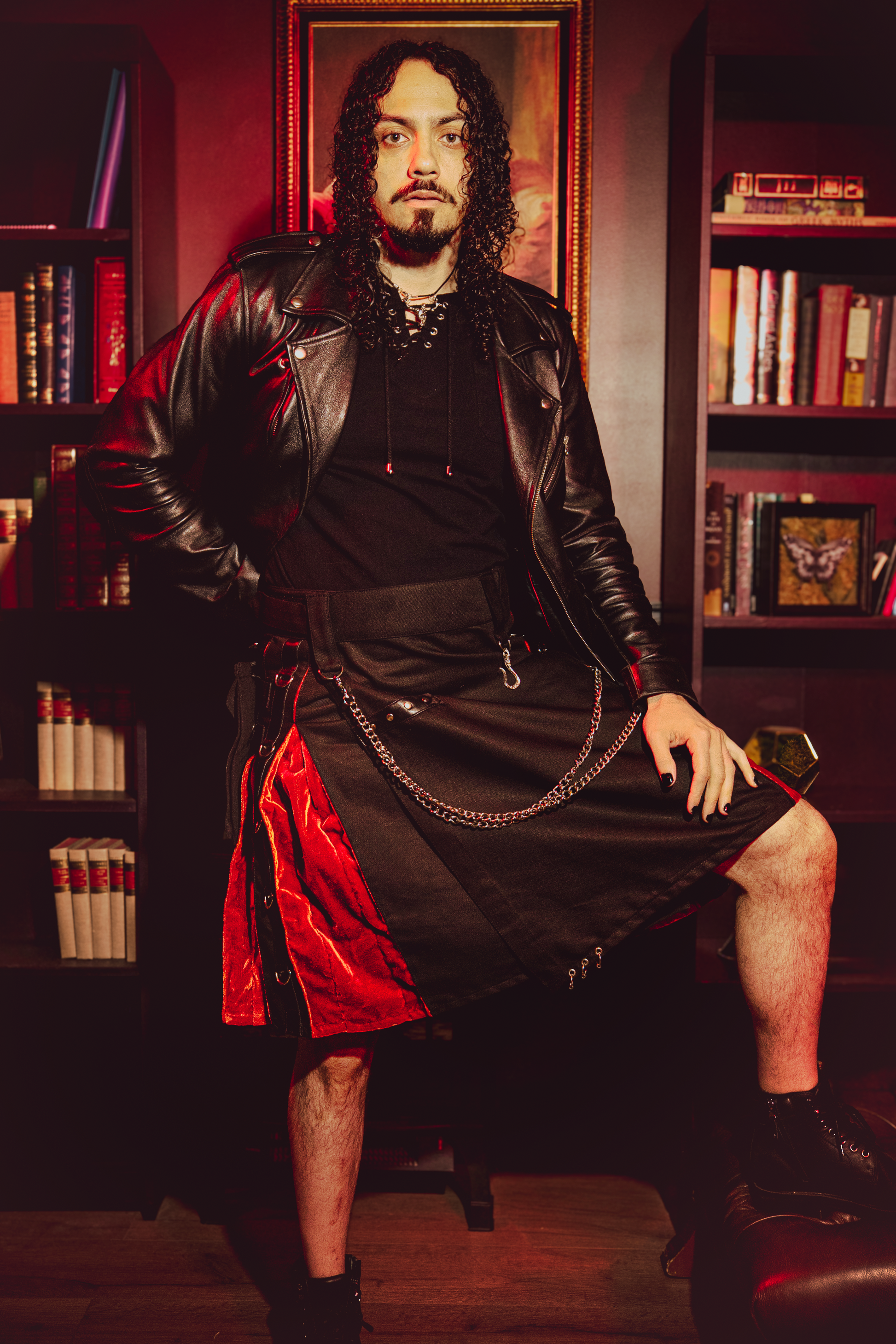 Bold by design. The Versatta Gothic Velvet Cargo Kilt cuts richly colored velvet pleats across black with striking chain accents and leather detail.